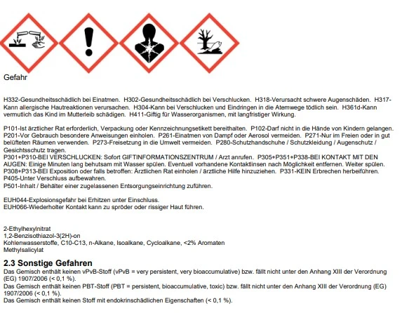H304 Kann bei Verschlucken und Eindringen in die Atemwege tödlich sein.