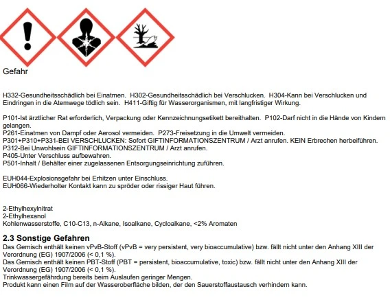 H304 Kann bei Verschlucken und Eindringen in die Atemwege tödlich sein.