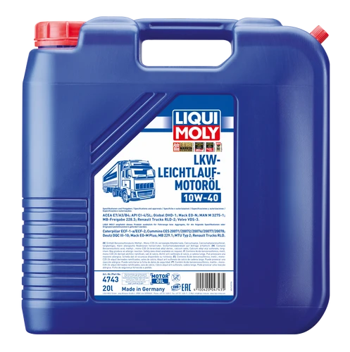 - 10W-40, 4743, A3/B4, CI-4, Caterpillar ECF-1-a, Caterpillar ECF-2, CaterpillarECF-1-a, CaterpillarECF-2, Cummins CES 20071, Cummins CES 20072, Cummins CES 20076, Cummins CES 20077, Cummins CES 20078, CumminsCES20071, CumminsCES20072, CumminsCES20076, CumminsCES20077, CumminsCES20078, Deutz DQC III-10, DeutzDQCIII-10, E7, Global DHD-1, GlobalDHD-1, LKW-Leichtlauf-Motoröl 10W-40, LKW-Leichtlauf-Motoröl10W-40, MAN M 3275-1, MANM3275-1, MB 229.1, MB-Freigabe 228.3, MB-Freigabe228.3, MB229.1, MTU Typ 2, MTUTyp2, Mack EO-M Plus, Mack EO-N, MackEO-MPlus, MackEO-N, P000279, Renault Trucks RLD, Renault Trucks RLD-2, RenaultTrucksRLD, RenaultTrucksRLD-2, SL, VOLVO VDS-3, VOLVOVDS-3