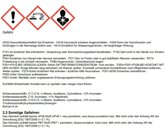 EUH066 Wiederholter Kontakt kann zu spröder oder rissiger Haut führen.