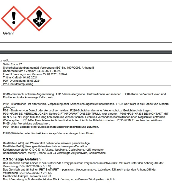 H304 Kann bei Verschlucken und Eindringen in die Atemwege tödlich sein.